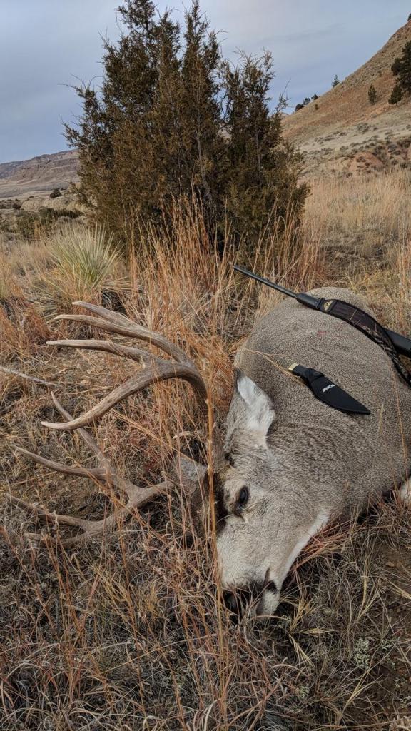 I hadn’t caught my breath yet when the buck came out of the ravine and started up the other side of the arroyo. Once he got to the top, I grunted with the gun resting on my knee in the sitting position. The buck stopped broadside at my 200 yard range point. The crosshairs were going up and down with my heavy breathing. I couldn’t get my wind back! Frantically, I tried to time my breathing and squeezed the trigger. I knew the shot was high, REAL high, as in 4 feet high! The deer took a few steps up the hill and I grunted again. He stopped quartering away. This time I concentrated on slowing my breathing, relaxing, and taking a little more time. I also asked for some help from above, and happened to focus on one word….GRIT! I’m not sure why that word entered my head, but I think my Dad would say it on occasion. I kept telling myself I HAVE grit. I have grit so I don’t wound this amazing animal. I have grit because I’m in Montana. I have GRIT because I’ve covered six miles with a nice buck in the crosshairs. I squeezed the trigger as the crosshairs sat squarely on the bucks opposite shoulder and the buck collapsed without taking a step! YES!!!