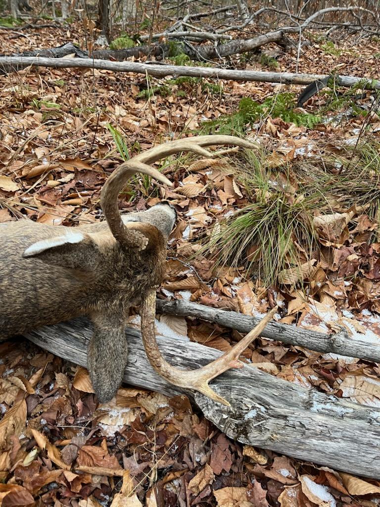 I watched and waited for a solid ten minutes, still not knowing what exactly he had for horns. He had not moved at all, but I was not taking any chances with a broken rifle. If I were a smoker, I would have burned a half a pack in those ten minutes! I sent out a quick “Brown is Down” text to Gary, Glen, Tom, and The Crew. Texts with congrats and high fives were coming in nonstop! Folks who hunt the Adirondacks fairly, like the way we do, understand the effort involved. Gary called shortly after and could probably hear my heart pounding through the phone! I could not give him any more information about the buck other than he was down, and I could see him, he had not moved, and that my gun was jammed. I also let him know my location. After the call, I cautiously made my way down to the buck with a knife drawn! He was a nice wide racked 6 pointer with no brow tines. A beautiful buck. He had two broken off points on his rack, obviously from fighting, which will be fueling my fire all year in the hopes that I can catch up with one of his superiors. He was not the one that had been ravaging the big trees, but I was very proud of this buck and how hard I had worked for him. I sat down next to him and made my peace and as always thought about and appreciated Pop, my brothers, and all that had gone into this season culminating here. I pulled Pop’s knife out of my pack and got him field dressed and after several pictures began to drag him little by little back up the hill to the nearest skidder trail. I had not heard back from Dave T yet, being right at a mile from where I had parked, and with light snow just starting to fall, I was sure hoping he was on the Northway!