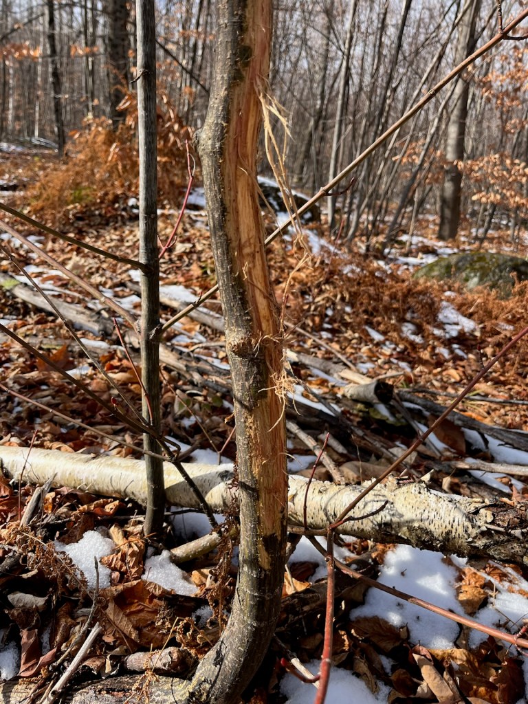 The past few days it was becoming clear that the rut was in full swing. I had seen a few bucks acting like they were looking for does on my way into town. Two nights earlier I stumbled upon two bucks fighting on my walk out well after shooting light had faded. Just yesterday I jumped a big deer out of his bed and caught a glimpse of a horn as he bolted out of sight. When I found his bed, I could easily detect a strong smell of tarsal glands! Gary was also reporting grunting and chasing bucks at his camp, and he had let a small buck walk the day before. It was time to be spending full days in the woods, which was my plan again today as I crunched my way up the mountain trail to my cutoff location. My plan was to hunt my way to the area I wanted to watch from downwind. The forecast was calling for 3-6 inches of snow this evening and I figured after a full breakfast, I’d get positioned in place to be able to watch a long ridge of Beech trees that also caught a lot of midday sun where I had found several recent beds. There were also several large buck trees close by that had been shredded recently. I made my way slowly trying not to overheat but as always brought dry shirts and extra layers to change into once I got situated. Replacing a sweat dampened first layer T shirt with a dry one is a game changer on a cold breezy day if you plan to stay in till dark and be comfortable. Last night had been the coldest night so far with temperatures at sunrise being 16 degrees.